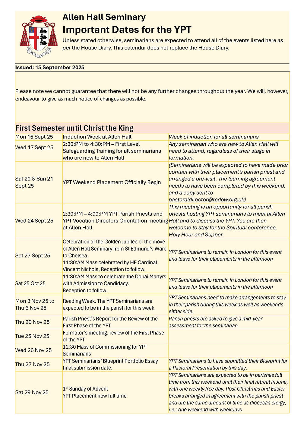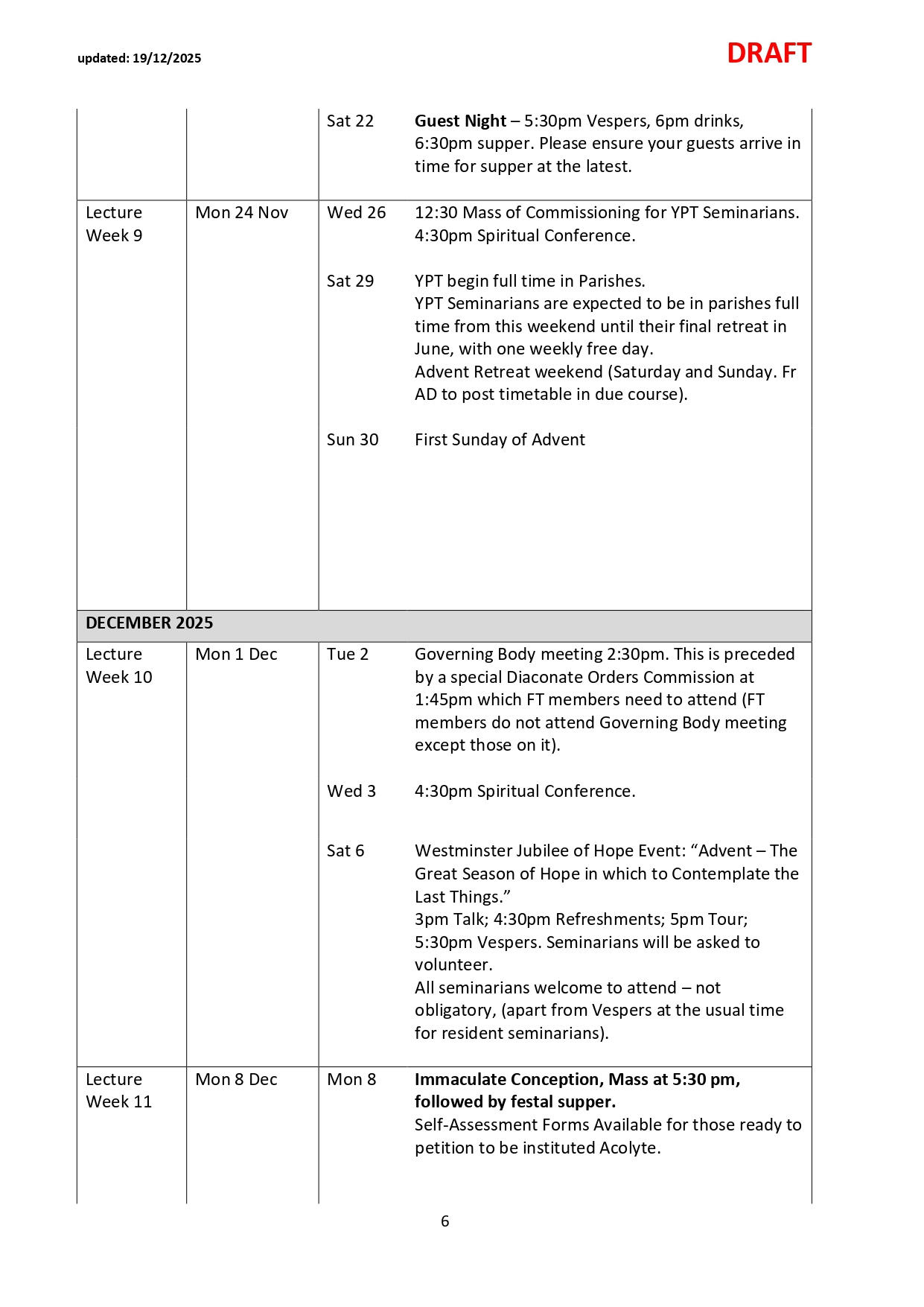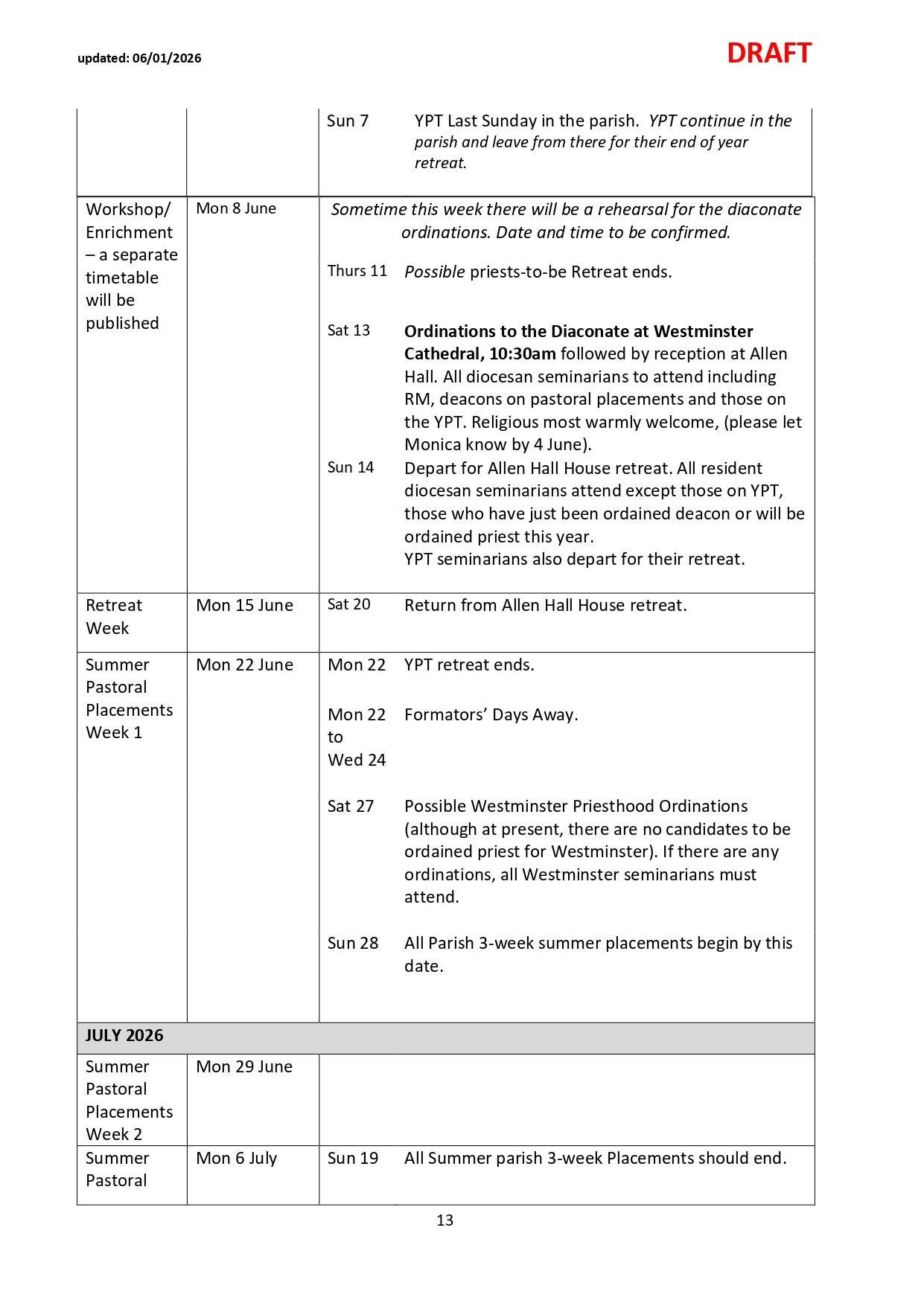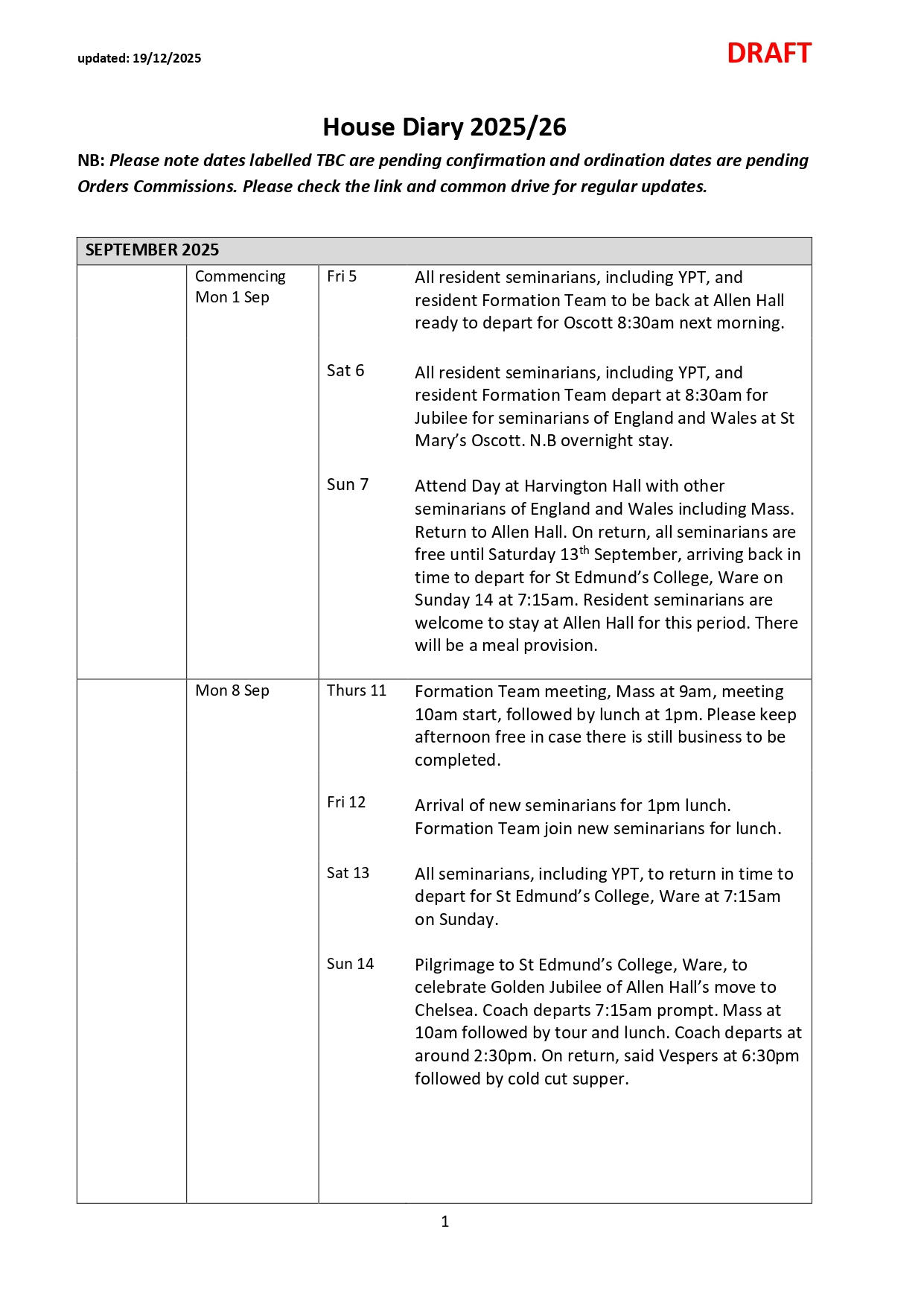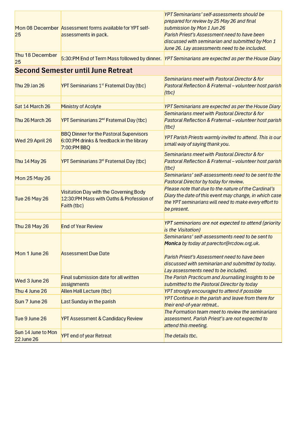 NB: Please note dates labelled TBC are pending confirmation and ordination dates are pending Orders Commissions. Please check the link and common drive for regular updates.